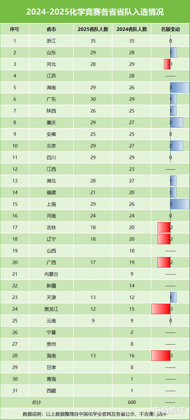2025年各省省队规模的调整延续了“以赛促优”的动态平衡逻辑。湖南凭借生物竞赛24枚金牌的亮眼表现,省队总人数将增至38人,成为全国规模最大的省队之一;江西作为2026年国赛承办地,借助奖励名额将省队规模从19人激增至27人,实现跨越式增长。
